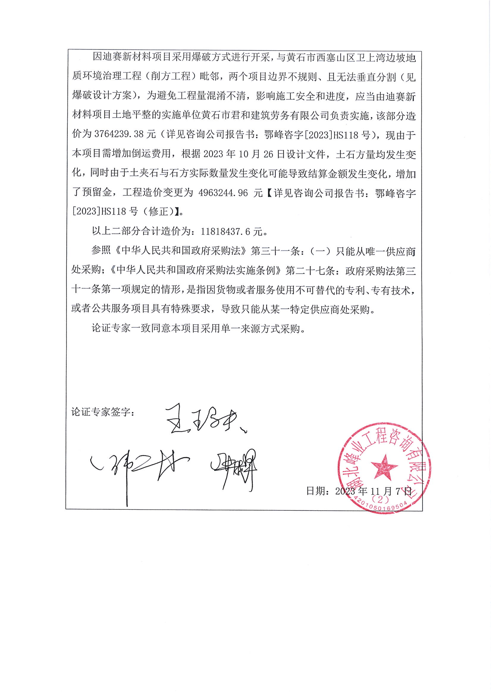 (2)黃石市西塞山區(qū)衛(wèi)上灣邊坡地質(zhì)環(huán)境治理工程(削方工程):因迪賽新材料項(xiàng)目采用爆破方式進(jìn)行開(kāi)采,與黃石市西塞山區(qū)衛(wèi)上灣邊坡地質(zhì)環(huán)境治理工程(削方工程)毗鄰,兩個(gè)項(xiàng)目邊界不規(guī)則、且無(wú)法垂直分割(見(jiàn)爆破設(shè)計(jì)方案),為避免工程量混淆,影響施工進(jìn)度,應(yīng)當(dāng)由迪賽新材料項(xiàng)目土地平整的實(shí)施單位黃石市君和建筑勞務(wù)有限公司負(fù)責(zé)實(shí)施,該部分造價(jià)為3764239.38元(詳見(jiàn)咨詢公司報(bào)告書:鄂峰咨字[2023]HS118號(hào))。
